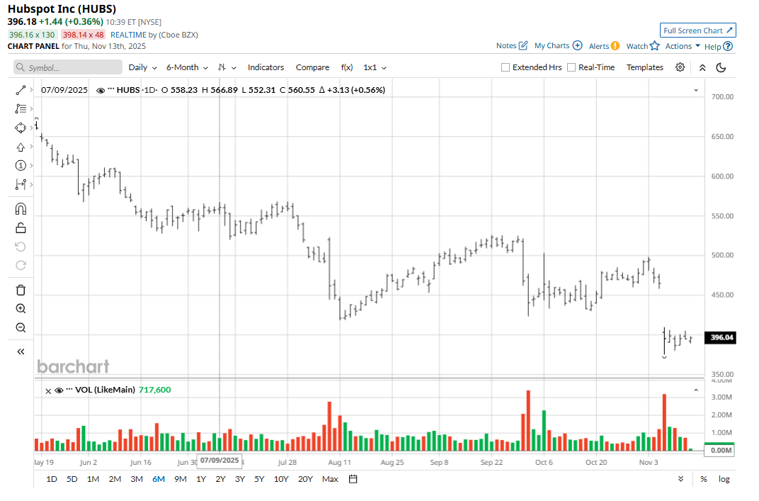 In 2024, HUBS generated revenue of $2.6 billion, along with an operating loss of $63.6 million. Last quarter, its top line increased 18%, excluding currency fluctuations, versus the same period a year earlier to $809.5 million, while its operating income came in at $11.2 million, versus an operating loss of $9.6 million in Q3 of 2024. The firm's operating margin in Q3 of 2025 was only 1.4%.