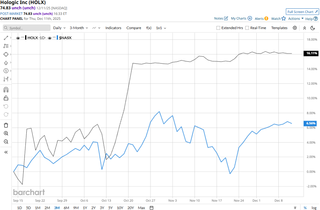 Hologic stock touched its 52-week high of $76.29 on Dec. 12, 2024, and is currently trading 1.9% below that peak. Meanwhile, HOLX stock soared 12.7% over the past three months, outpacing the Nasdaq Composite’s ($NASX) 7% gains during the same time frame.