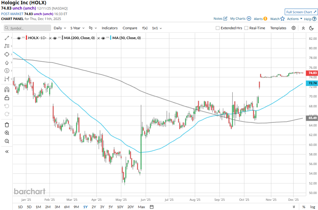 Hologic has traded mostly above its 50-day moving average since late May and above its 200-day moving average since early August, with some fluctuations, underscoring its bullish trend.