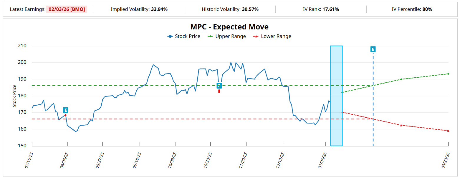 Looking at Marathon’s Expected Move calculator — a formulation derived from the Black-Scholes model — MPC stock shows a possible dispersion between $162.38 and $189.96 for the Feb. 20, 2026, expiration date. This projection helps to explain why the smart money optimists are targeting the $180 to $185 range.