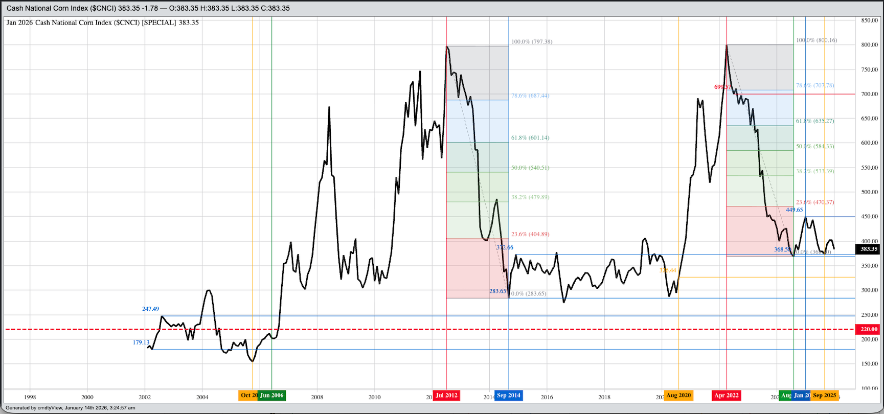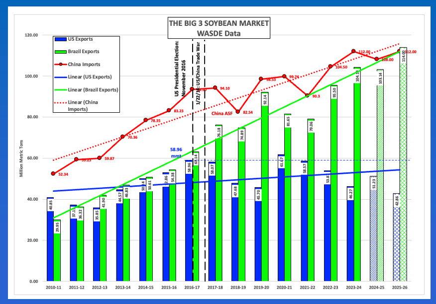 Soybeans: The soybean market should not be considered a US national resource, and therefore not a key part of economic, strategic, or political strategy. The ongoing trade war with China has made sure the US is no longer a key player in the global market with USDA’s latest guess on export demand of 42.9 million metric tons (mmt) for the 2025-26 marketing year. If realized, this would be the lowest US export figure since 2012-13’s 35.9 mmt. Meanwhile, USDA estimated Brazil’s exports to climb to a new record of 114.0 mmt. Again, if realized, this would mean the US would ship only 38% of Brazil’s exports. Reportedly, at the end of the 2014-2015 marketing year (August 2015), there was only a 1% difference between the world’s two largest exporters. Then came the US presidential election of 2016 and the social media created trade war in January 2018. We will get our next weekly export sales and shipments update, for the week ending Thursday, January 8, tomorrow morning with the spotlight on unshipped sales of US soybeans to China. As for the US market, the National Soybean Index ($CNSI) came in Tuesday night near $9.69, with the previous 5-year low end of January price near $9.78 from last year.