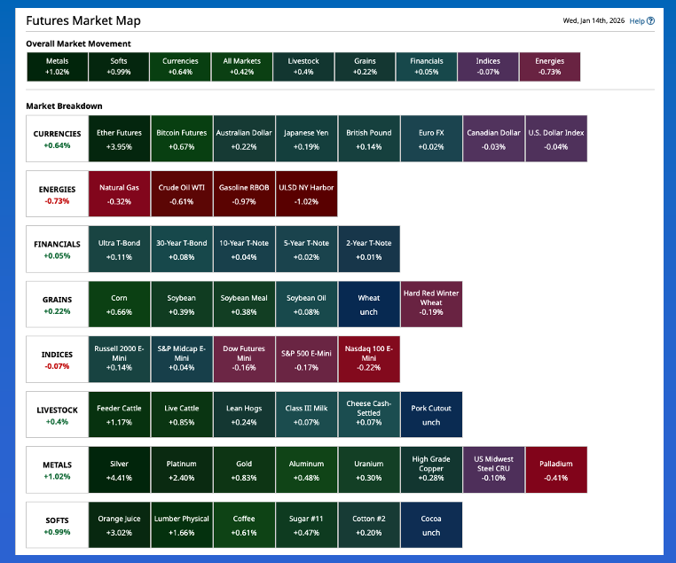Morning Summary: The phrase of the day would seem to be “Resource Nationalism”. As I checked the pre-dawn news, this term was used a number of times as an answer to Tuesday’s question of if Metals are being driven higher by safe-haven buying only. One of the headlines on CNBC.com Wednesday morning was, “Resource nationalism could propel gold to $5,000 and silver to $100 this year”. What is “resource national”? I asked Al, as in Bundy, also known as AI (Artificial Intelligence), and the algorithm replied with, “when a government asserts greater control over its natural resources for economic, strategic, or political reasons”. Recall I talked about gold at 5K last fall, though silver took center stage late in the year. Overnight saw the March issue (SIH26) take out $90 on its way to an all-time high (so far) of $91.37, up $5.03 (5.8%). Within the CNBC story was the tidbit “China placed export controls on the metal in December”, part of why silver acted like a short-supply market last month. Then there was this headline, “China’s annual trade surplus hits a record $1.2 trillion” despite shipments to the US declining for a ninth straight month. My takeaway from this is China doesn’t need the US, putting the spotlight on the flip side of that coin.
