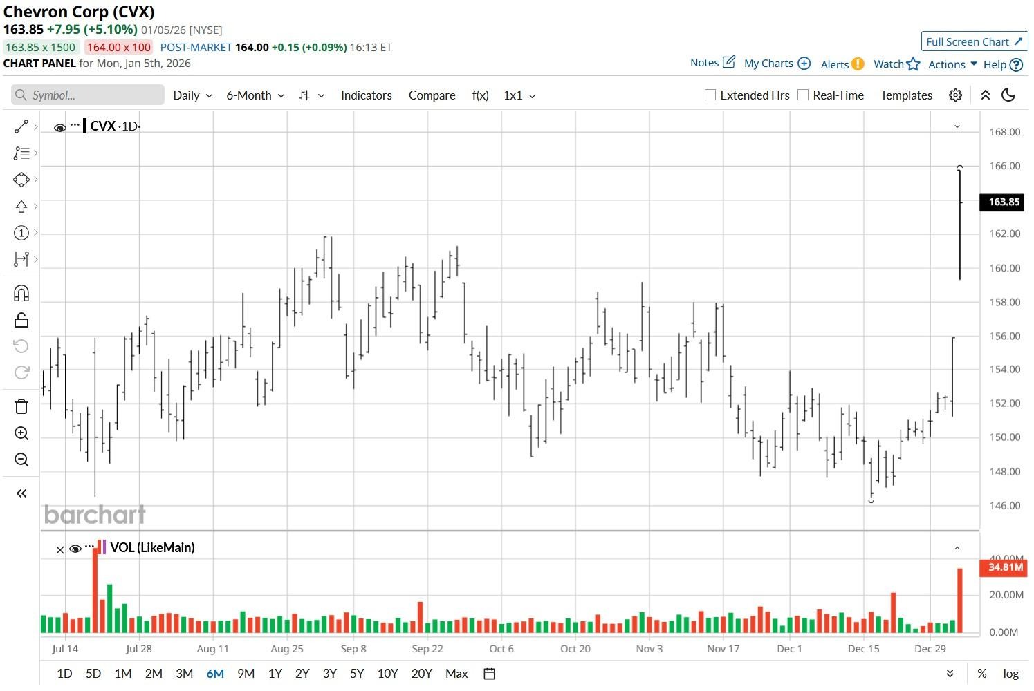 Chevron (CVX) shares extended gains on Jan. 5 as investors treated President Donald Trump’s administration’s strike on Venezuela as an opportunity for U.S. oil companies.