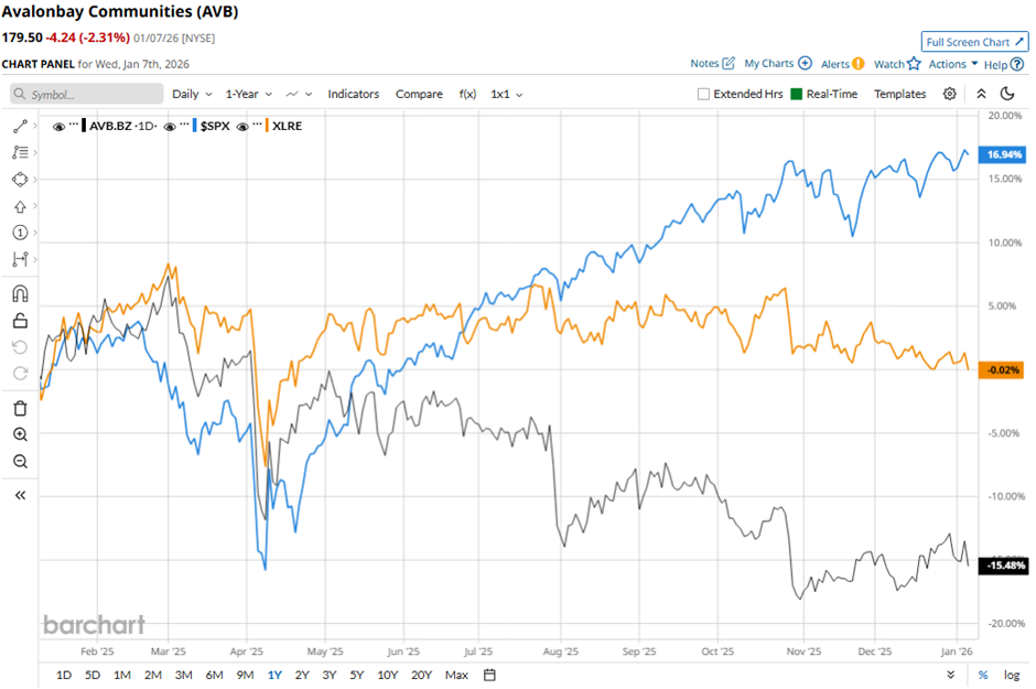 AVB stock has decreased 15% over the past 52 weeks, lagging behind the S&P 500 Index's ($SPX) 17.1% gain and the State Street Real Estate Select Sector SPDR ETF's (XLRE) marginal rise over the same period.