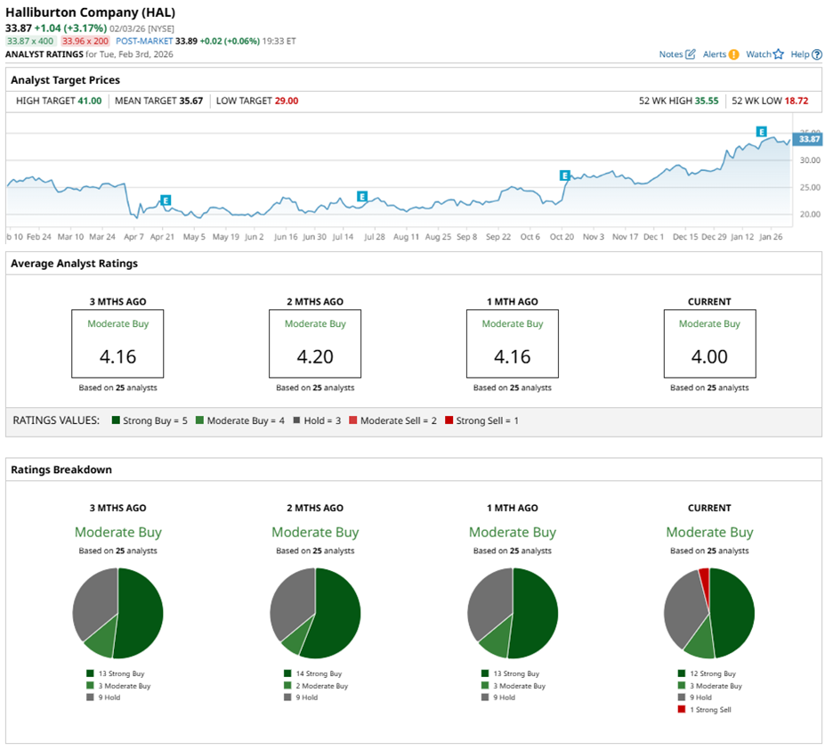 Wall Street leans constructively on the stock, assigning it an overall “Moderate Buy” rating. Of the 25 analysts covering HAL stock, 12 rate it a “Strong Buy,” three favor a “Moderate Buy,” nine recommend “Hold,” and just one flags a “Strong Sell.”
