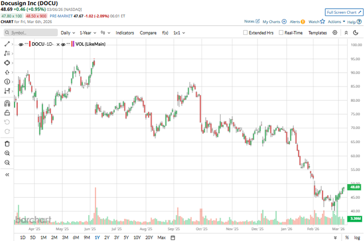 E-signature pioneer DocuSign (DOCU) is gearing up to report its quarterly earnings for the fourth quarter of fiscal 2026 on March 17 after the market closes. Amid the artificial intelligence (AI) boom, as software names face market pressures, the company’s growth has slowed, which is concerning investors.