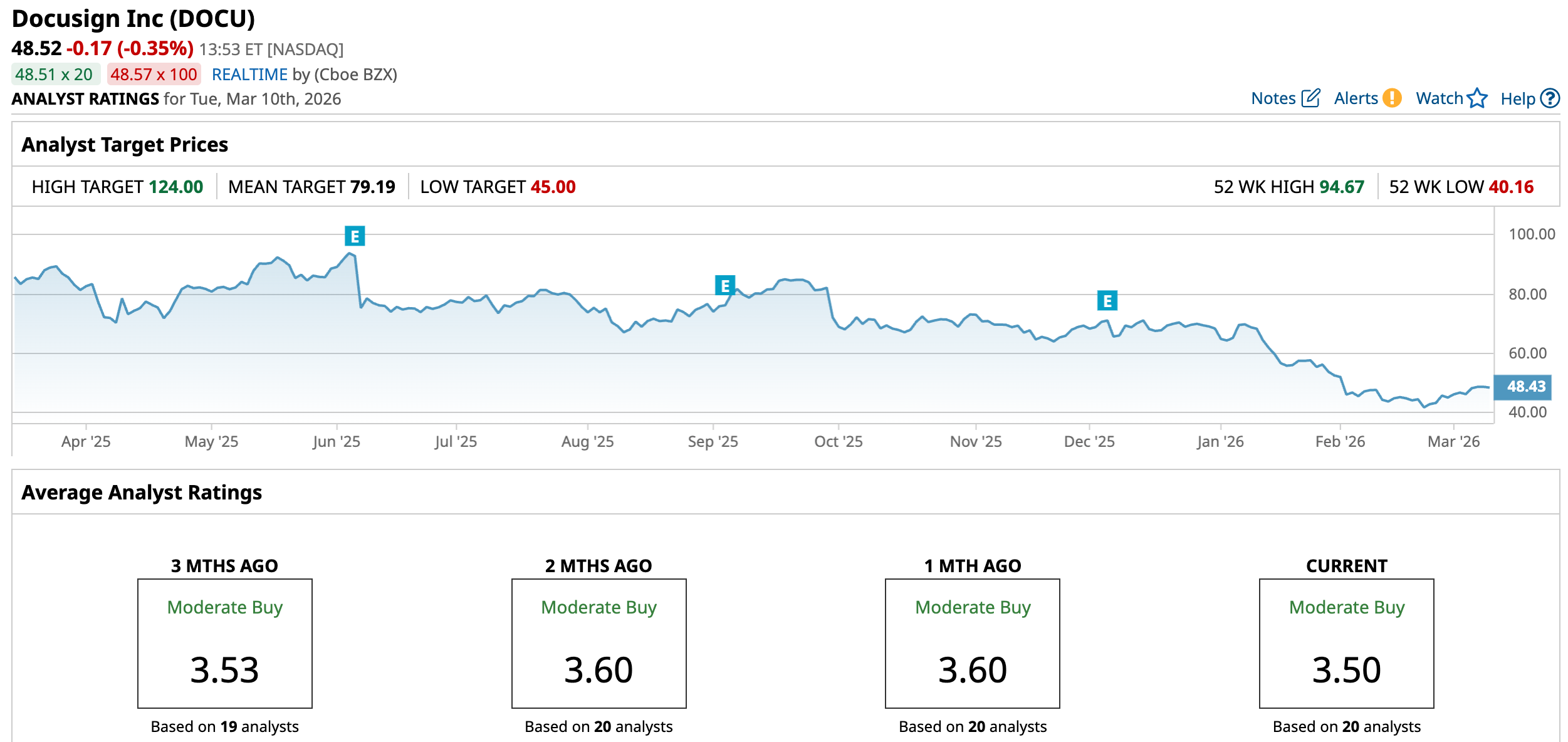 Over the past 52 weeks, the stock has declined by 37.66%, while it has been down 29.04% year-to-date (YTD). Just for comparison, the S&P 500 index ($SPX) is up 21.59% over the past 52 weeks and is down marginally at 0.28% YTD. DocuSign’s shares reached a 52-week low of $40.16 on Feb. 25, but are up 16.6% from that level.