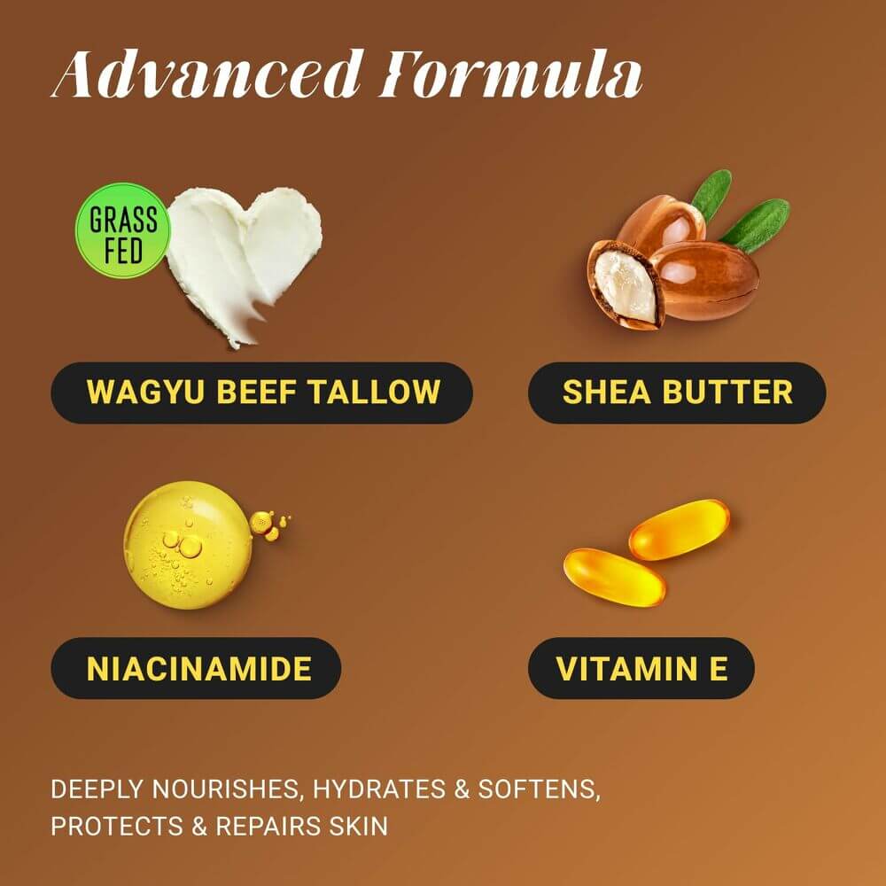 The Wagyu Beef Tallow Cream features a refined composition built around grass-fed Wagyu tallow, an ingredient naturally rich in vitamins A, D, K, and E. Combined with niacinamide, shea butter, and vitamin E, the formulation is engineered to enhance elasticity, restore moisture balance, and reinforce the skin barrier. The result is a lightweight, fast-absorbing texture that stands in contrast to traditional heavy balms, providing lasting hydration without a greasy finish. Laboratory evaluations cited by the company indicate up to a seventy-six-percent improvement in barrier strength following regular use, confirming the product’s anti-aging efficacy.