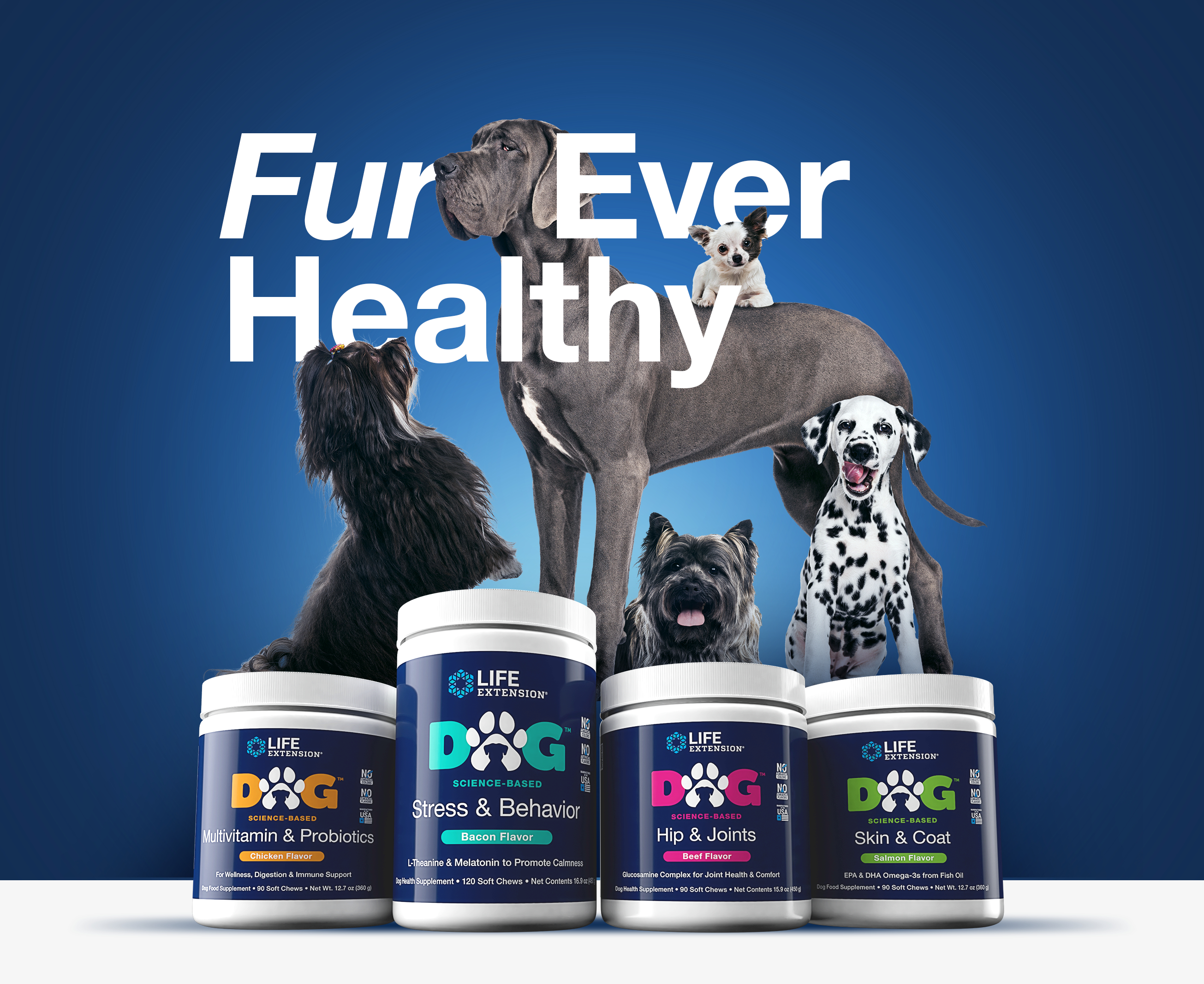 Life Extension® DOG is a new addition to Life Extension’s assortment of more than 400 vitamins and supplements. The new line of pet supplements contains no artificial colors or flavors and is manufactured in the USA. To see the entire line, go to LifeExtension.com/dogsupplements.