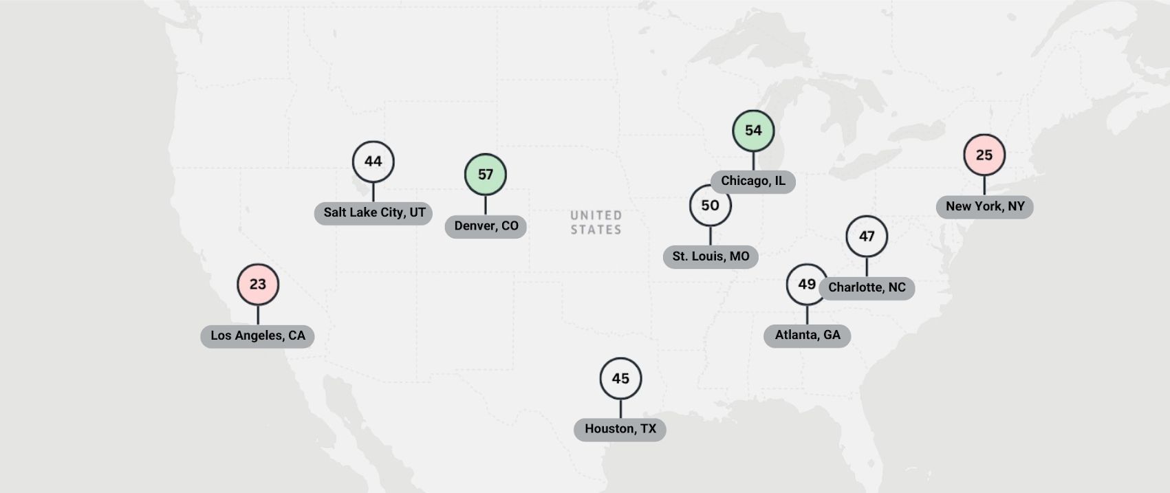 - Charlotte (47) and Houston (45) fall into the moderate range, with opportunities to boost resilience and reduce congestion impacts.