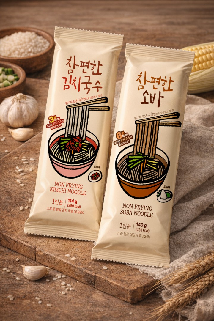 Champhyeonhan Kimchi Noodles and Soba use non-fried, grease-free noodles that highlight the authentic taste of the broth. In particular, the kimchi noodles maintain the refreshing and clean taste characteristic of kimchi broth, as the broth does not become cloudy even after cooking. The soba is crafted with a focus on a light and refined flavor. Square-shaped noodles are used to emphasize the chewy texture.