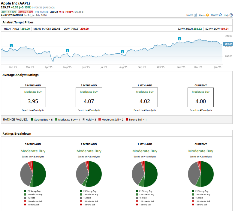 Apple has a consensus rating of “Moderate Buy” from the 42 analysts covering the stock. The stock’s mean target price of $289.48 is 11.6% higher than the Jan. 9 closing price. Clearly, the average sell-side analyst does not see much in the way of gains from the Cupertino-based company this year.