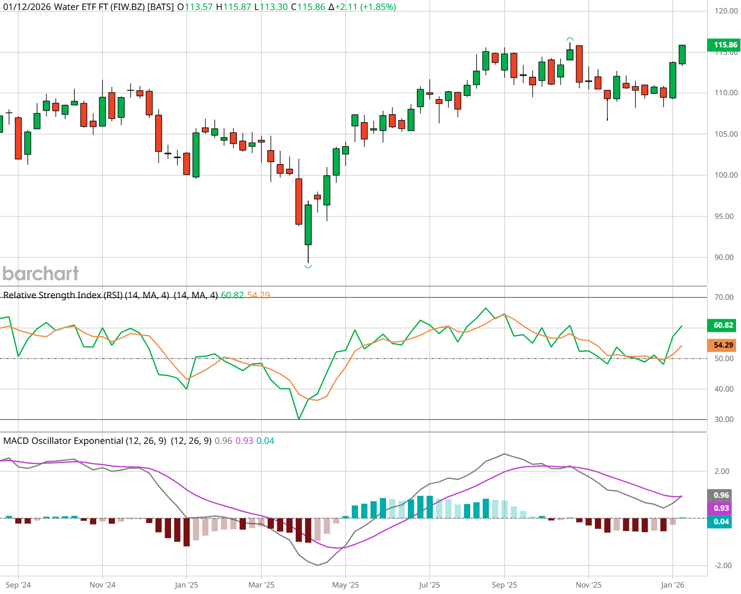 FIW looks pretty impressive, and will likely get added to my own long-term portfolio. The ETF has strong weekly momentum and is poised to make a new all-time high. Of course, you can't make a new high without taking out the old one – in this case, $116.16, set last October.