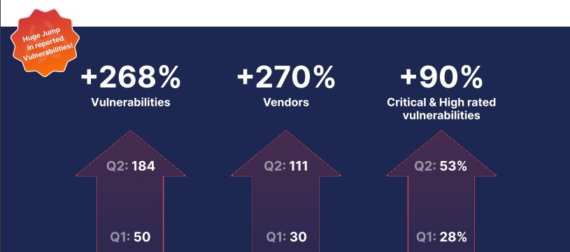 Compared to Q1, API vulnerabilities rose +268%; impacted more vendors +270% and grew in criticality rating +90%