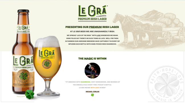 About the company: Le Grá Beer Ltd. is an independent company based in London, UK dedicated to sharing the magic, heritage, and pure spirit of Ireland through premium lagers brewed with 100% Irish ingredients. Its flagship beer, Le Grá ("with love" in Irish), is a golden lager infused with real shamrocks for ancient Irish luck. For more information, visit www.legrabeer.com.