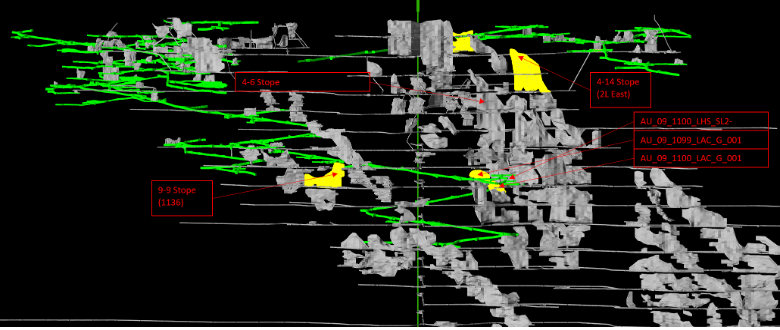 Figure 5. A long section of the Madsen Mine showing historic mining. Remnant open stopes that West Red Lake Gold has identified as potentially suited for CRF waste rock storage are highlighted in yellow.