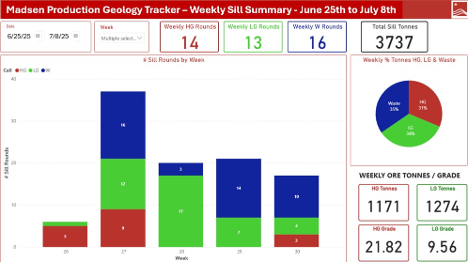 Figure 3. Weekly Sill Summary for June 25-July 8 from the Madsen Mine Production Geology Grade Control Tracker. This figure is provided only as an example to demonstrate grade performance at Madsen for the month of July. The Production Geology Report is a tool used solely for internal grade control tracking purposes and should not be considered prescriptive of the Madsen Mine resource estimate or assumed as National Instrument 43-101 – Standards of Disclosure for Mineral Projects (“NI 43-101”) compliant.